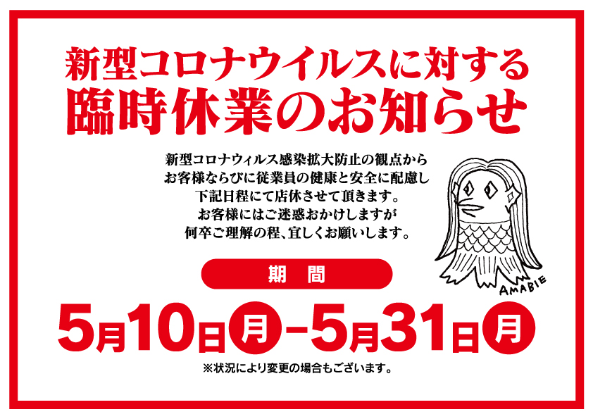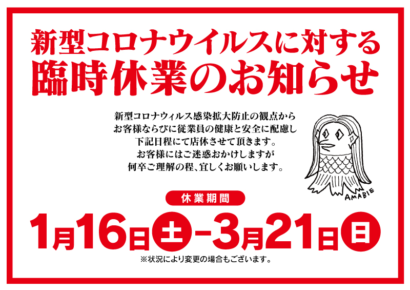 お客様ならびに従業員の健康と安全を考慮し下記の期間、臨時休業を取らせて頂きます。