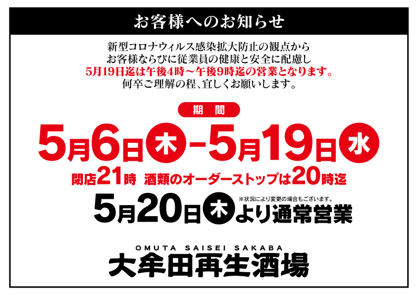 お客様ならびに従業員の健康と安全を考慮し時短営業を再開いたします。