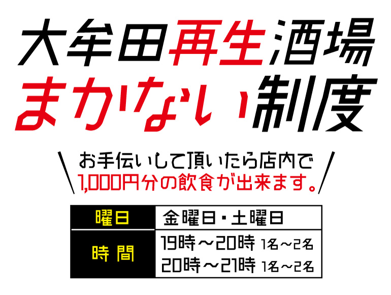 まかない制度 東京にある未来食堂の“まかない制度” 2年前に“未来食堂の本”を読んで共感しました。 なので大牟田再生酒場でも“まかない制度”を導入しました!! 男女年齢不問、全くの未経験者でもOKです! 大牟田再生酒場で働いて飲んでみませんか? 【 曜 日 】 金曜日 / 土曜日 【 時 間 】 ・19時〜20時 1名~2名 ・20時〜21時 1名~2名 >>大牟田再生酒場facebookはこちら<< ※著しく健康を害している方、衛生的に問題のある方、日本語/英語に不自由のある方などは当店の判断によりお断りする場合があります。ご了承ください。