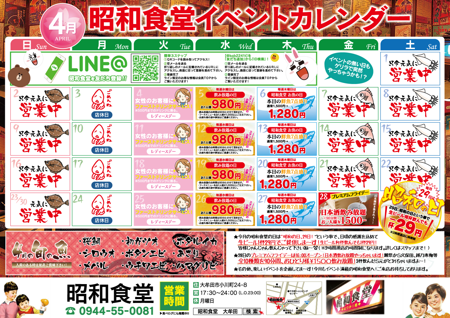 イベントカレンダー 4月昭和食堂イベントカレンダー 投稿日: 2017年4月1日2017年4月19日 omuta-re_kuruma 4月はお花見シーズン!ということで花見終わりの二次会に昭和食堂はいかがでしょうか? 新鮮なお刺身がお待ちしてますよ😉😉 さて、今月の目玉イベントは😉❔ 🌸毎週火曜はレディースデー 🌸毎週水曜は飲み放題の日! 🌸毎週木曜はお魚の日! 🌸4月28日(金) プレミアムフライデーは日本酒飲み放題! 🌸4月19日(土) 毎月29日は昭和の日、生ビール1杯29円! その他ゲリラでイベントやっちゃうかも?! 是非お楽しみください~(^ヮ^)